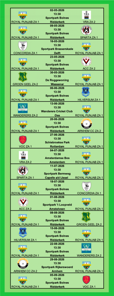 Wedstrijdschema KNCB 2026 SV Royal Punjab 1